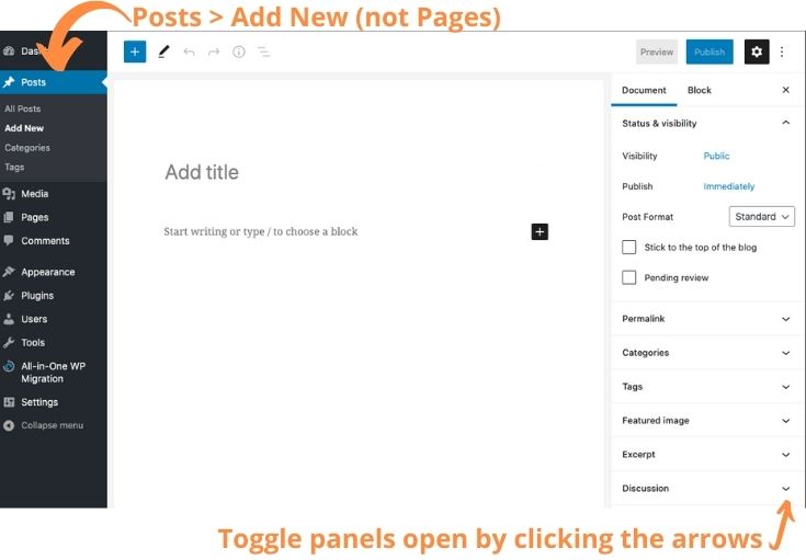 Let’s create a new blog post and publish it. Don’t get confused here, you don’t edit the page you created called Blog. The Blog page displays your posts but each post you write is on a separate URL. Your blog page aggregates all your posts onto one page.